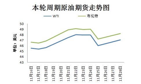 本輪計價周期內(nèi),國際原油價格呈現(xiàn)先漲后跌再漲態(tài)勢。截至11月28日收盤,當(dāng)日,美國WTI原油期貨漲1.02美元,報收47.08美元/桶;布倫特原油期貨漲1.00美元,報收48.24美元/桶。