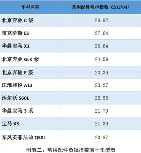 常用配件負擔指數(shù)方面,在汽車零整比系數(shù)基礎(chǔ)上,挖掘事故車維修數(shù)據(jù),選取配件損失率大于 1%的常用配件進行研究,導(dǎo)入計算公式核算各車型的常用配件負擔指數(shù)。在樣本車型中最高的車型為北京奔馳 C級,常用配件負擔指數(shù)為 28.82;最低的車型為哈弗 H6,常用配件負擔指數(shù)為 9.32。