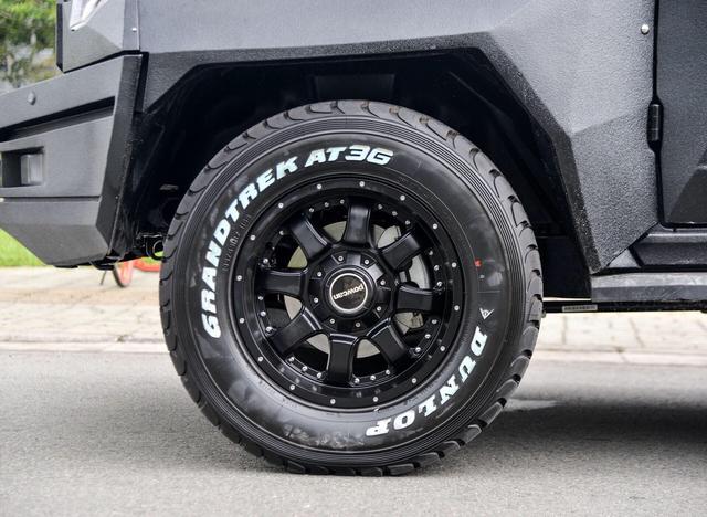 車身表面使用了亞光色涂裝,披上厚重的鋼板并經(jīng)過高溫噴砂處理,車窗采用了高強度復(fù)合玻璃,厚度比起一臺iPhone7還要厚。幾乎全車做過了防彈處理和碳纖維處理,側(cè)面還取消了C柱和D柱,換裝了具有一定防爆能力的輪胎,據(jù)說輪胎支持在全部破損的情況下勻速行駛。
