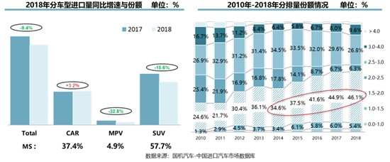 再以車型分類來看,2018年,三大進(jìn)口車型的銷量出現(xiàn)明顯分化。其中,轎車銷量增長3.2%,是唯一保持增長的車型;SUV的銷量占比雖達(dá)到57.7%,但其銷量卻出現(xiàn)15.6%的明顯下滑;MPV更是大幅下降32.8%。此外,進(jìn)口車排量下移也成為趨勢,1.5升-2.0升排量進(jìn)口車的銷量占比從2014年的34.6%升至46.1%,達(dá)到較高水平;與之相對(duì),3.0升-4.0升排量進(jìn)口車銷量則出現(xiàn)較明顯的下滑。