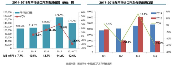 此外,2018年,平行進(jìn)口汽車銷量出現(xiàn)了5年來的首次下滑,且市場波動(dòng)明顯。2018年,平行進(jìn)口車銷量占進(jìn)口車總銷量的12.6%,達(dá)13.97萬輛,同比下滑18.6%,下滑幅度遠(yuǎn)超進(jìn)口車市場整體表現(xiàn)。