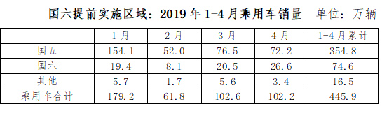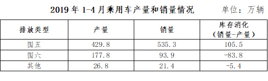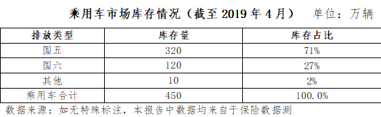 中汽協(xié)發(fā)布的數(shù)據(jù)顯示, 截至2019年4月份,我國乘用車庫銷比達3.1,遠高于行業(yè)1.5的警戒線;行業(yè)整體庫存約450萬輛,國五車輛庫存320萬輛左右(占行業(yè)庫存的71%),其中國六提前實施區(qū)域的國五車輛庫存175-220萬輛(調(diào)研企業(yè)推算得出)。