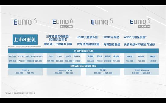 5月18日,上汽MAXUS EUNIQ 5和EUNIQ 6兩款車(chē)型正式上市,其中EUNIQ 5推出7款車(chē)型,售價(jià)區(qū)間為16.58萬(wàn)-23.03萬(wàn)元,EUNIQ 6共推出8款車(chē)型,售價(jià)區(qū)間為16.58萬(wàn)-23.50萬(wàn)元。新車(chē)可通過(guò)上汽MAXUS“蜘蛛智選”智能選配平臺(tái),選擇包括外觀飾件、內(nèi)飾風(fēng)格、座椅布局等在內(nèi)的近百種配置。