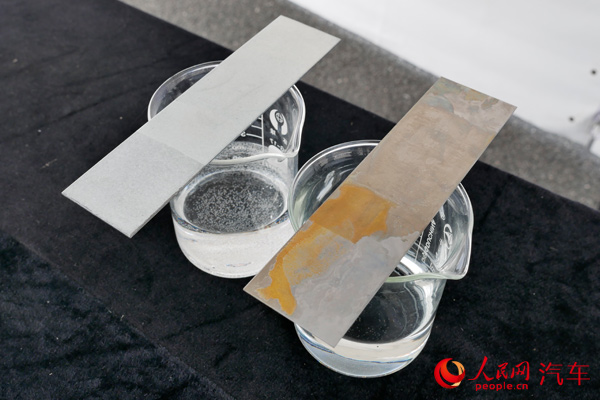 在汽車(chē)制造技術(shù)中,車(chē)身結(jié)構(gòu)在經(jīng)過(guò)焊接成型后,都需要通過(guò)電泳池進(jìn)行鍍鋅工藝,以防止車(chē)身在日后使用環(huán)境中被腐蝕,最終得到的“白車(chē)身”再進(jìn)行漆面噴涂工序。記者看到,實(shí)驗(yàn)人員將不鍍鋅鋼板和經(jīng)過(guò)鍍鋅鋼板分別放入8%的鹽酸溶液中,放置20秒左右,取出用水沖洗,然后靜置20分鐘,普通鋼板表面出現(xiàn)明顯紅色銹蝕,鍍鋅鋼板表面無(wú)明顯銹跡。