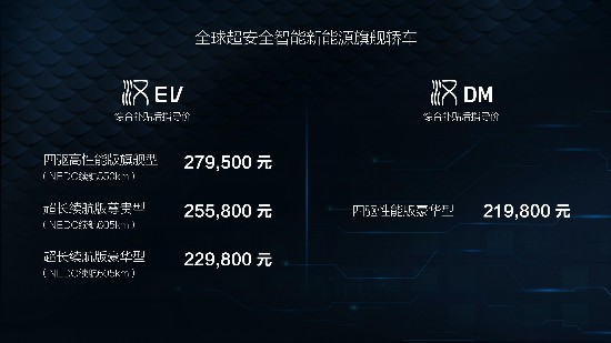 7月12日,比亞迪宣布“全球超安全智能新能源旗艦轎車”漢正式上市,上市車型包含三款漢EV和一款漢DM。全國綜合補(bǔ)貼后,漢EV超長續(xù)航版豪華型售價(jià)22.98萬元、漢EV超長續(xù)航版尊貴型售價(jià)25.58萬元、漢EV四驅(qū)高性能版旗艦型售價(jià)27.95萬元;漢DM四驅(qū)性能版豪華型售價(jià)21.98萬元。