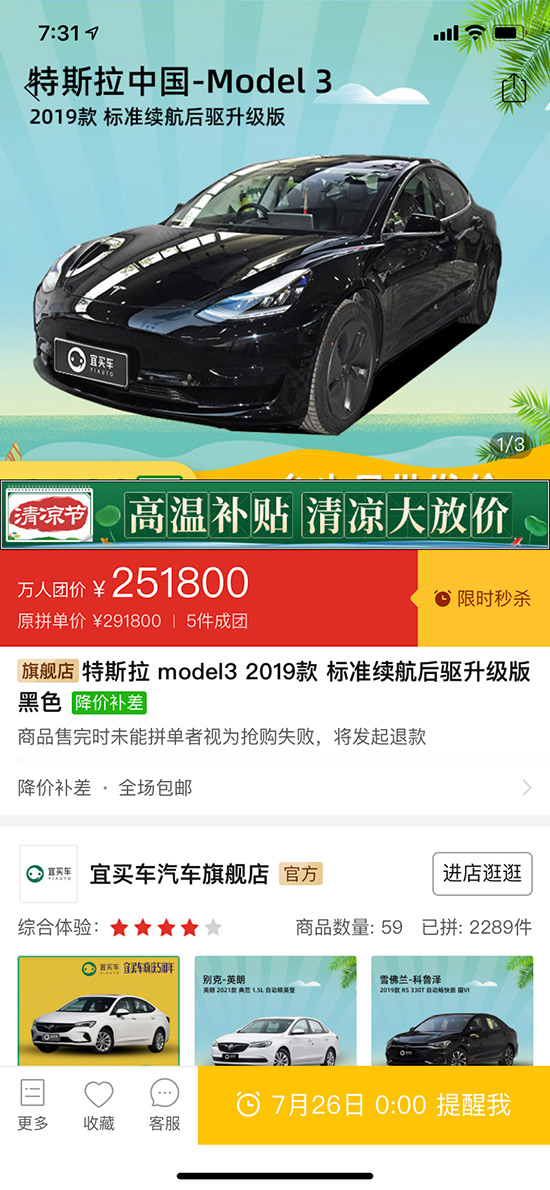 今年7月21日,連鎖汽車銷售平臺宜買車聯(lián)合拼多多推出了一場特斯拉萬人團購活動。活動期間,特斯拉官方指導價為27.155萬元的特斯拉Model 3 標準續(xù)航后輪驅動升級版 ,在拼多多平臺上的團購價為每臺25.18萬元,團購價格比官方售價便宜了近2萬元。