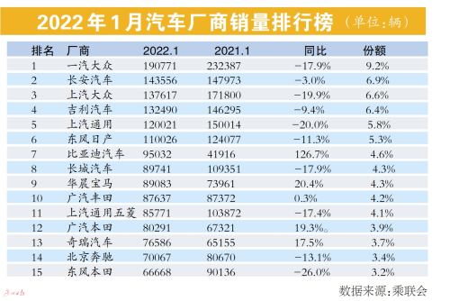 近日,乘聯(lián)會(huì)公布了2022年1月全國乘用車市場(chǎng)分析。整體來看,1月,國內(nèi)狹義乘用車銷量為209.2萬輛,同比下降4.4%,環(huán)比小幅下滑0.6%。乘聯(lián)會(huì)指出,1月廠商庫存下降11萬輛,渠道庫存環(huán)比下降9萬輛;歷年的1月是去庫存的重要節(jié)點(diǎn),今年1月庫存去除較好。