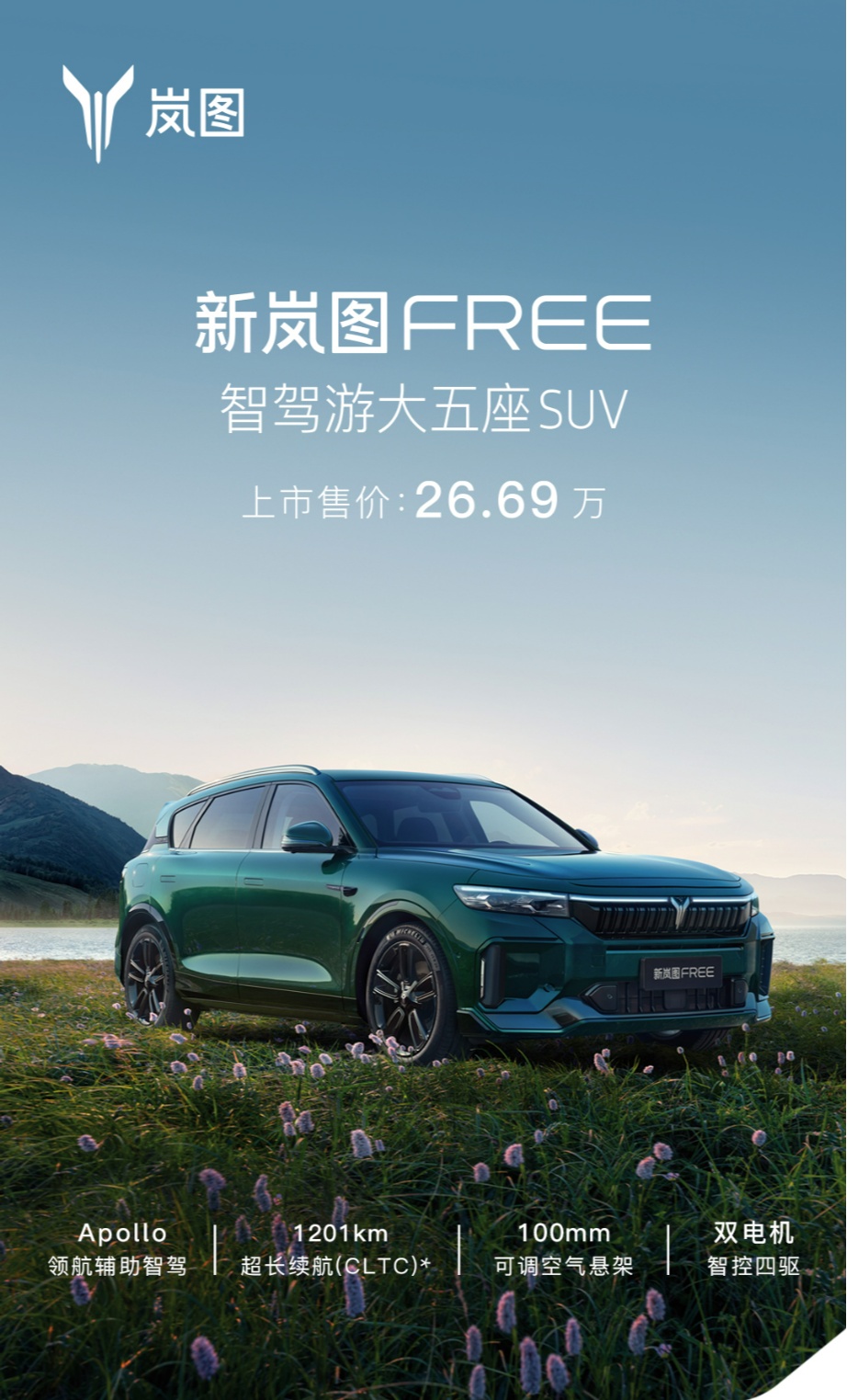 嵐圖汽車CEO盧放表示,作為“智駕游大五座SUV”,新嵐圖FREE的“智”,代表Apollo Highway Driving Pro領(lǐng)航輔助智駕帶來的智駕體驗(yàn);“駕”,意味著繼承了嵐圖品牌基因里的駕控實(shí)力;“游”,則是超長(zhǎng)續(xù)航、超低能耗以及豪華配置帶來的舒適享受。新嵐圖FREE有智慧、有力量、有激情,專為追求自由的“公路旅行家”打造,嵐圖期待與廣大用戶一起,盡情釋放心中的自由,奔赴遠(yuǎn)方,開啟人生的“智駕游”。