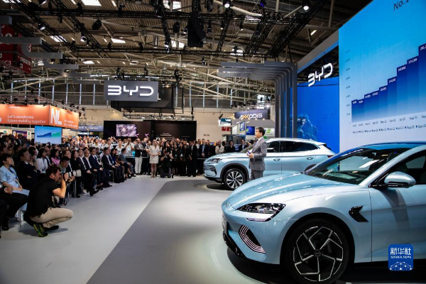 這是9月4日在德國(guó)慕尼黑國(guó)際車展媒體預(yù)展上拍攝的比亞迪發(fā)布會(huì)現(xiàn)場(chǎng)。