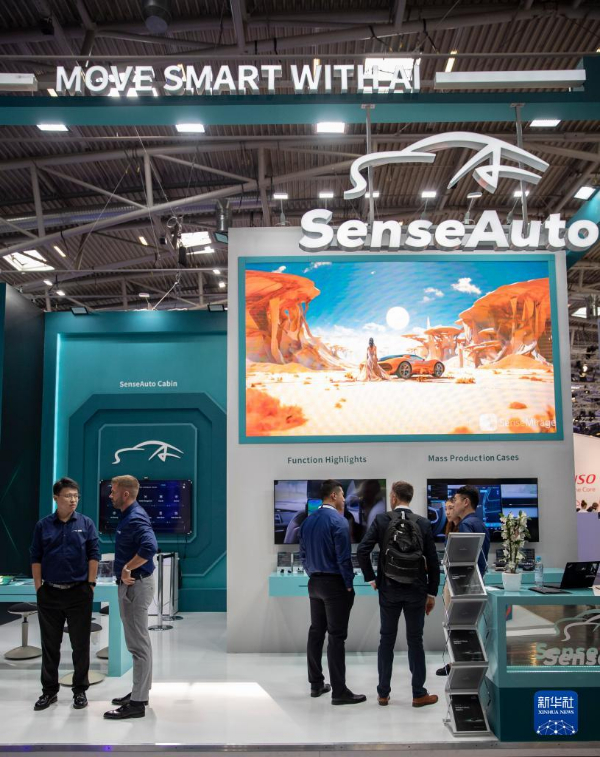 這是9月4日在德國(guó)慕尼黑國(guó)際車展媒體預(yù)展上拍攝的商湯科技展臺(tái)。