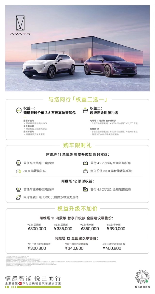 權(quán)益一,1月8日后購車的用戶贈送限時價值26,000元高階智駕包,以不依賴高精地圖的NCA帶來全域都領(lǐng)先的高速城區(qū)泊車全覆蓋體驗。權(quán)益二,活動期間購車用戶可享5倍定金膨脹禮遇,5000定金抵扣25,000元車款,車價立減兩萬元。與此同時,阿維塔推出更多貼心限時權(quán)益:首任車主終身三電質(zhì)保,6000元置換補(bǔ)貼即刻擁有;另外,全系車主可享智能香氛系統(tǒng)贈送,并擁有首付4.2萬元起、全期限超低息的購車金融權(quán)益。與此同時,阿維塔 11 鴻蒙版智享升級款全國零售價30萬- 39萬元,真正做到產(chǎn)品升級不加價。