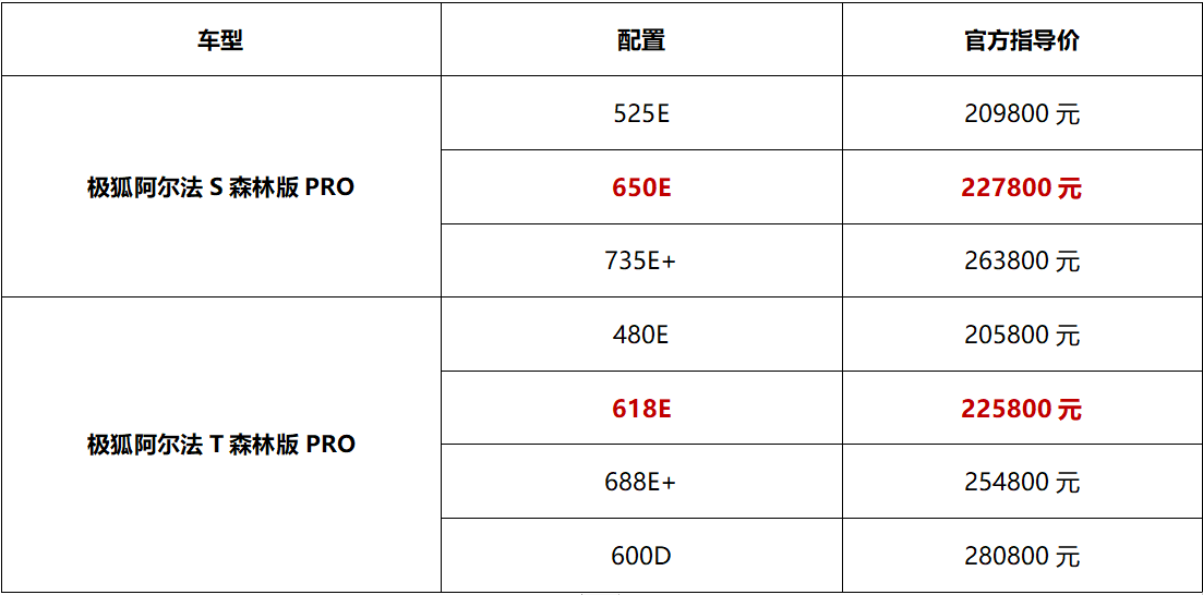 1月25日,極狐汽車(chē)旗下阿爾法S/T森林版PRO整體在原森林版基礎(chǔ)上,圍繞前后排座椅加熱/按摩、真皮方向盤(pán)、熱泵空調(diào)等豪華、舒適性配置進(jìn)行多維升級(jí),同時(shí)還新增了阿爾法S森林版PRO 650E、阿爾法T森林版PRO 618E,官方指導(dǎo)價(jià)分別為22.78萬(wàn)元、22.58萬(wàn)元。