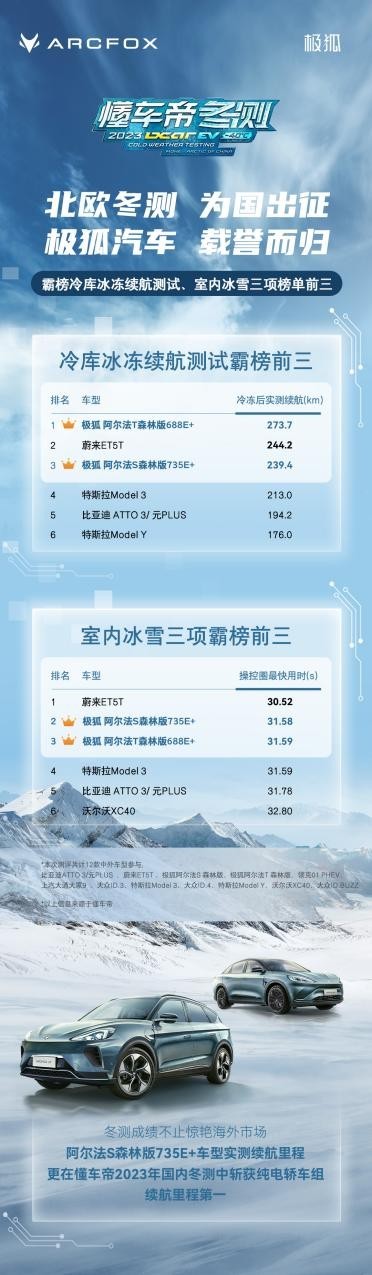 值得一提的是,就在剛剛結束的2023懂車帝冬測中,極狐汽車憑借優(yōu)異的表現驚艷國內及海外市場。其中,參賽車型阿爾法S森林版735E+,以368.8的實測續(xù)航里程在國內冬測中取得純電轎車組續(xù)航里程第一名的好成績。而阿爾法T森林版688E+、阿爾法S森林版735E+在北歐冬測中,更是以驚人的表現,實力霸榜冷庫冰凍續(xù)航測試、室內冰雪三項榜單前三,向世界展現了中國新能源汽車的卓越品質。