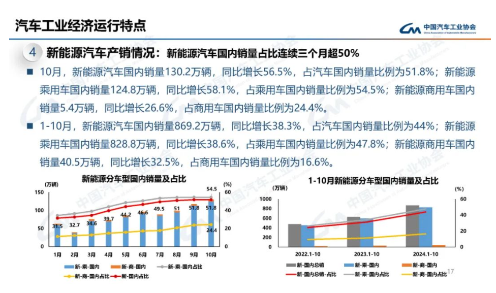 在新能源汽車(chē)方面,10 月,新能源汽車(chē)產(chǎn)銷(xiāo)分別完成 146.3 萬(wàn)輛和 143 萬(wàn)輛,同比分別增長(zhǎng) 48% 和 49.6%,新能源汽車(chē)新車(chē)銷(xiāo)量占汽車(chē)新車(chē)總銷(xiāo)量的 46.8%。1-10 月,新能源汽車(chē)產(chǎn)銷(xiāo)分別完成 977.9 萬(wàn)輛和 975 萬(wàn)輛,同比分別增長(zhǎng) 33% 和 33.9%,新能源汽車(chē)新車(chē)銷(xiāo)量達(dá)到汽車(chē)新車(chē)總銷(xiāo)量的 39.6%。