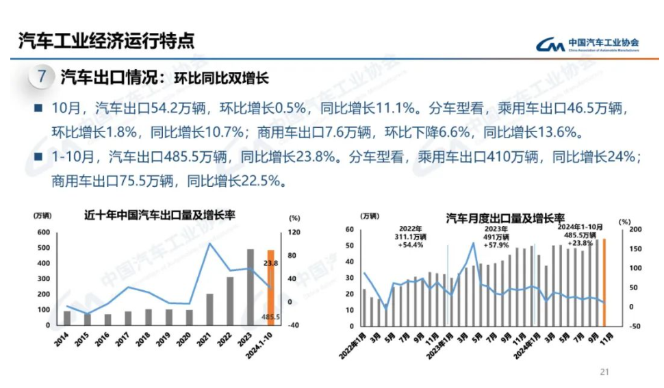 在汽車(chē)出口方面,10月,汽車(chē)出口 54.2 萬(wàn)輛,環(huán)比增長(zhǎng) 0.5%,同比增長(zhǎng) 11.1%。1-10 月,汽車(chē)出口 485.5 萬(wàn)輛,同比增長(zhǎng) 23.8%。