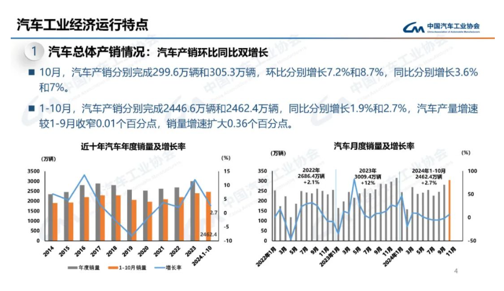 中汽協(xié)發(fā)布數(shù)據(jù)顯示,10月,汽車(chē)產(chǎn)銷(xiāo)分別完成299.6萬(wàn)輛和305.3萬(wàn)輛,環(huán)比分別增長(zhǎng)7.2%和8.7%,同比分別增長(zhǎng)3.6%和7%。1-10月,汽車(chē)產(chǎn)銷(xiāo)分別完成2446.6萬(wàn)輛和2462.4萬(wàn)輛,同比分別增長(zhǎng)1.9%和2.7%,汽車(chē)產(chǎn)量增速較1-9月收窄0.01個(gè)百分點(diǎn),銷(xiāo)量增速擴(kuò)大0.36個(gè)百分點(diǎn)。