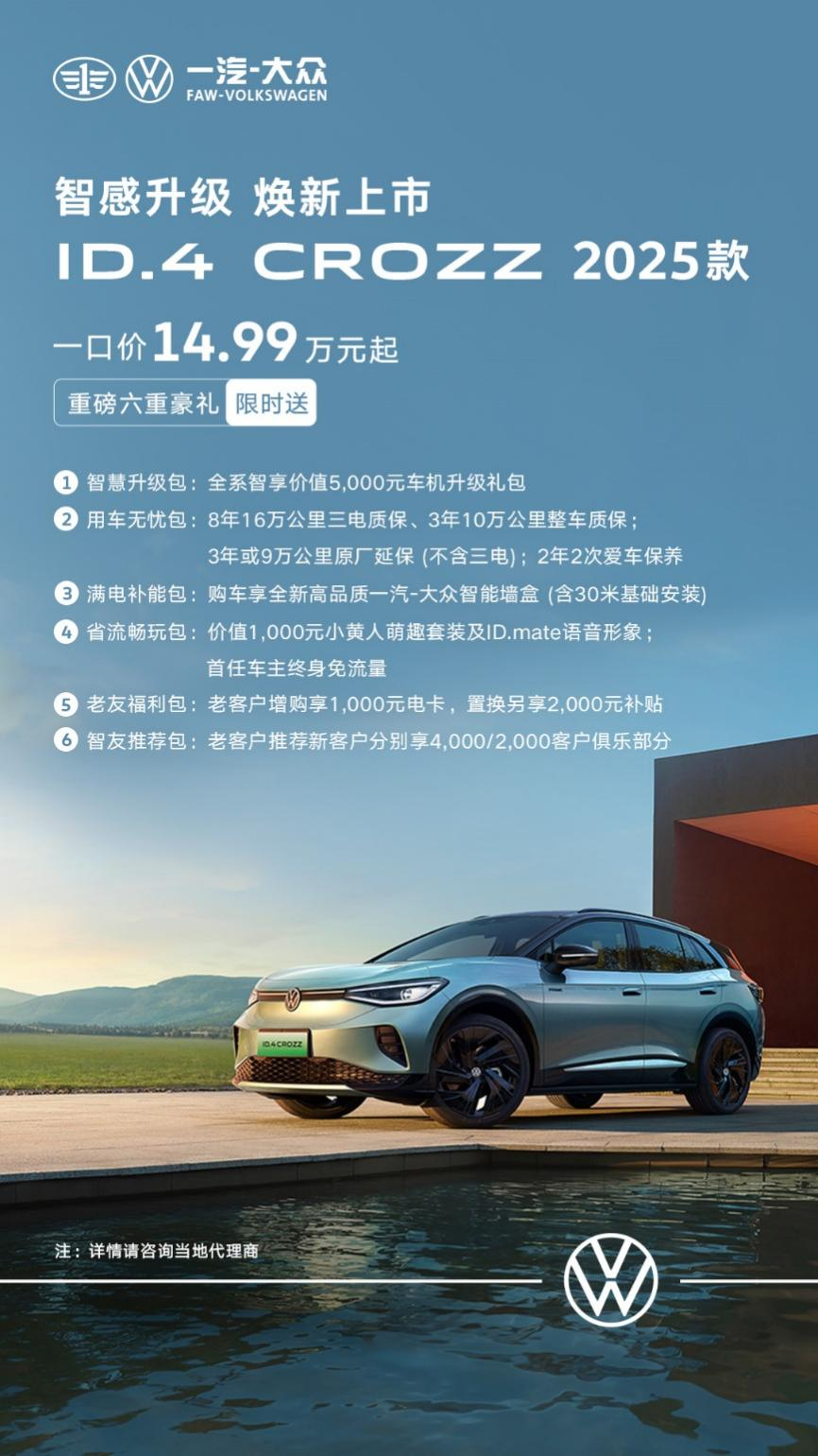 一汽-大眾ID.4 CROZZ作為MEB專屬純電平臺(tái)打造的純電汽車產(chǎn)品,憑借超高標(biāo)準(zhǔn)的整車安全、純正德系操控、真實(shí)續(xù)航及舒享空間,深受消費(fèi)者喜愛。隨著2025款產(chǎn)品的推出,一汽-大眾ID.4 CROZZ將繼續(xù)為用戶提供更安全、更可靠、更智能的電動(dòng)出行體驗(yàn),共同開啟更加美好的出行新世界。