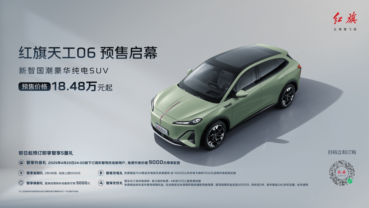 天工06定位新智國(guó)潮豪華純電SUV,除搭載了與天工05相同的司南智駕系統(tǒng)和靈犀座艙外,還配備了專屬超級(jí)適時(shí)智能四驅(qū)系統(tǒng),擁有毫秒級(jí)的四驅(qū)介入響應(yīng),既可為用戶提供卓越的四驅(qū)駕乘體驗(yàn),又能讓用戶享受兩驅(qū)的極低電耗。此次紅旗品牌智能體驗(yàn)日天工06正式開(kāi)啟預(yù)售,預(yù)售價(jià)格18.48萬(wàn)元起,并帶來(lái)豐厚的“智享五重禮”預(yù)訂權(quán)益。