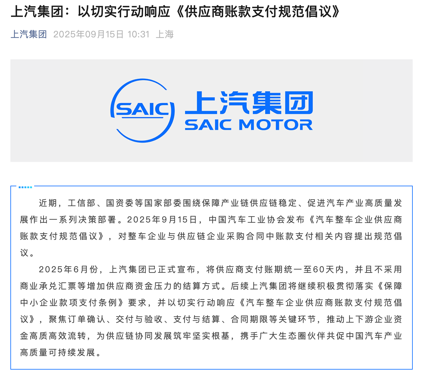 央廣網(wǎng)北京9月15日消息(記者董楠)9月15日,中國(guó)汽車工業(yè)協(xié)會(huì)(簡(jiǎn)稱“中汽協(xié)”)發(fā)布《汽車整車企業(yè)供應(yīng)商賬款支付規(guī)范倡議》,提出為了推動(dòng)汽車行業(yè)落實(shí)《保障中小企業(yè)款項(xiàng)支付條例》,支持重點(diǎn)車企高質(zhì)量踐行供應(yīng)商賬期承諾,在充分協(xié)商的基礎(chǔ)上,對(duì)整車企業(yè)與供應(yīng)商企業(yè)采購合同中賬款支付相關(guān)內(nèi)容作出規(guī)范倡議,規(guī)范涉及訂單確認(rèn)、交付與驗(yàn)收、支付與結(jié)算、合同期限多個(gè)環(huán)節(jié)。