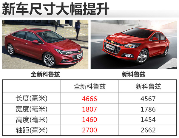全新科魯茲采用通用全新中級平臺打造,整車長寬高分別為4,666*1,807*1,460毫米,軸距為2,700毫米。車身長度與軸距相比現(xiàn)款車型,分別增加99和38毫米。對于同級別車型大眾速騰,全新科魯茲車身長度與軸距分別超出11和49毫米。乘坐空間將得到進一步的提升。