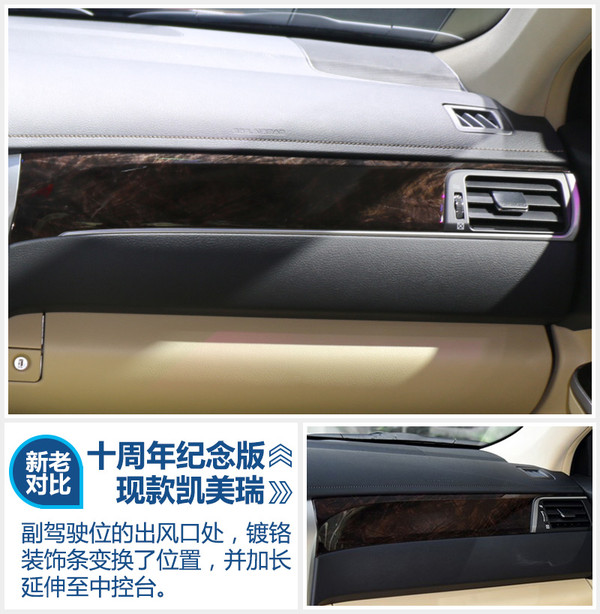 凱美瑞的“蛇形”換擋機(jī)制一直是筆者非常喜歡的設(shè)計,最起碼在開車的時候不會因為換錯擋而發(fā)生意外碰撞。但是說實話,裸露的檔桿總覺得缺了點什么。十周年紀(jì)念版將檔桿周圍加上了皮質(zhì)包裹,立馬將中控臺的“氣質(zhì)”提升了一個檔次,筆者本人是非常喜歡的。另外,副駕駛面前的木紋面板也增加了一條鍍鉻裝飾。