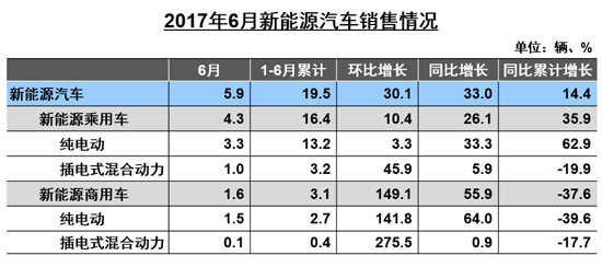 6月,新能源汽車產(chǎn)銷分別完成6.5萬輛和5.9萬輛,同比分別增長43.4%和33.0%,環(huán)比分別增長25.9%和30.1%;上半年,新能源汽車產(chǎn)銷分別完成21.2萬輛和19.5萬輛,比上年同期分別增長19.7%和14.4%。