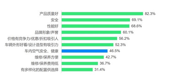 消費(fèi)者前三大購車考慮因素是質(zhì)量(82.3%)、安全(69.1%)和性能(68.6%),但疫情使車內(nèi)空氣安全和健康上升成為購車時(shí)的又一考量重點(diǎn)(46.5%)。