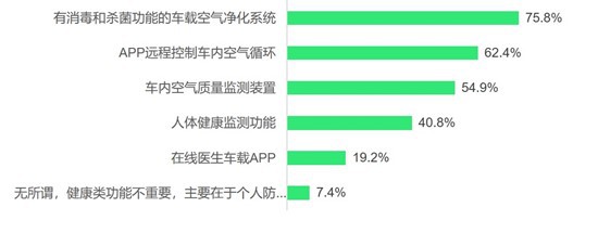 有消毒和殺菌功能的車載空氣凈化系統(tǒng)(71.9%)、APP遠(yuǎn)程控制車內(nèi)空氣循環(huán)(65.6%)和車內(nèi)空氣質(zhì)量監(jiān)測(cè)裝置(61.3%)是意向購車者最關(guān)注的健康類功能和配置。