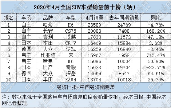 具體來看,4月,來自“自主三強(qiáng)”的三款車型哈弗H6、長安CS75和吉利博越包攬銷量前三。最終,4月共有5款自主車型入榜。