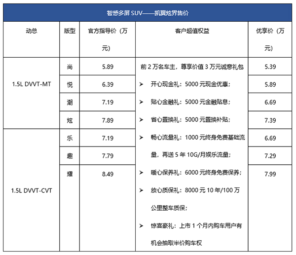 6月22日,凱翼炫界迎來上市。新車提供1.5L DVVT-MT、1.5L DVVT-CVT兩種動力組合,共計7款車型,售價為5.39萬元——7.99萬元。