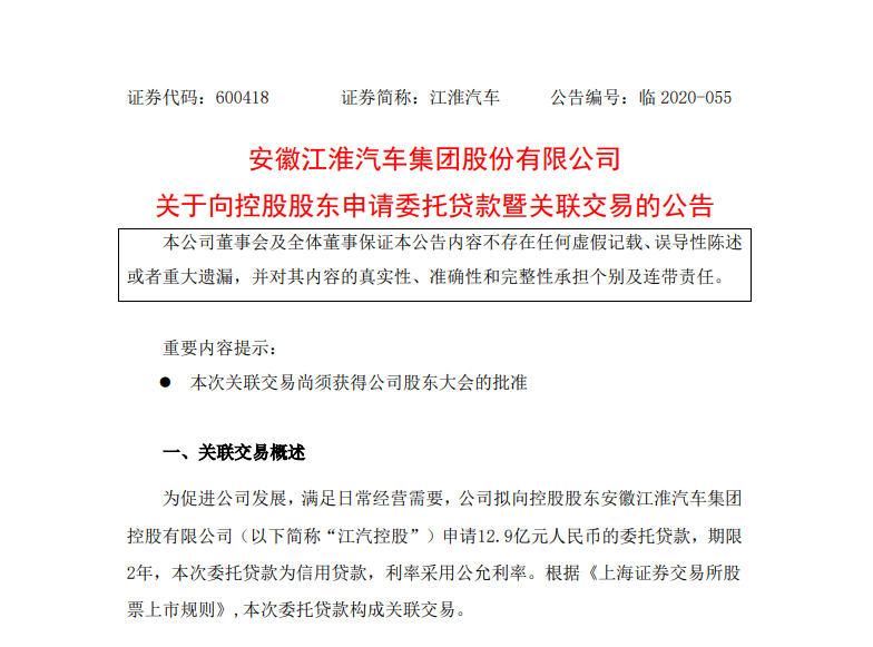 同日,江淮汽車還發(fā)布了向控股股東申請委托貸款的公告。公告顯示,為促進(jìn)公司發(fā)展,滿足日常經(jīng)營需要,公司擬向控股股東安徽江淮汽車集團控股有限公司申請12.9億元人民幣的委托貸款,期限2年。