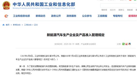 人民網(wǎng)北京8月20日電(王紫)19日,工信部正式發(fā)布了修改后的《新能源汽車(chē)生產(chǎn)企業(yè)及產(chǎn)品準(zhǔn)入管理規(guī)定》(以下簡(jiǎn)稱(chēng)“規(guī)定”)。《規(guī)定》刪除了包括第五條以及《新能源汽車(chē)生產(chǎn)企業(yè)準(zhǔn)入審查要求》等附件中有關(guān)“設(shè)計(jì)開(kāi)發(fā)能力”的相關(guān)內(nèi)容;將新能源汽車(chē)生產(chǎn)企業(yè)停止生產(chǎn)的時(shí)間由12個(gè)月調(diào)整為24個(gè)月;刪除了有關(guān)新能源汽車(chē)生產(chǎn)企業(yè)申請(qǐng)準(zhǔn)入的過(guò)渡期臨時(shí)條款?!兑?guī)定》將自2020年9月1日起施行。