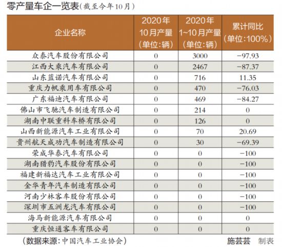 正如蔡榮華所言,我國汽車產(chǎn)銷量占全球30%左右,企業(yè)競(jìng)爭(zhēng)日趨激烈,但是盲目投資、產(chǎn)能利用率比較低的問題尚未得到有效解決?!吨袊嚬I(yè)產(chǎn)銷快訊》(2020年第11期)數(shù)據(jù)顯示,在總共被統(tǒng)計(jì)的88家汽車企業(yè)中,今年10月汽車產(chǎn)量為零的汽車企業(yè)竟然多達(dá)17家(事實(shí)上,這一數(shù)據(jù)在8月為16家),今年前10個(gè)月產(chǎn)量低于500輛的共有25家,其中,有8家生產(chǎn)企業(yè)今年未生產(chǎn)過1輛汽車,占比接近一成。
