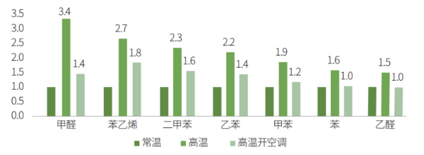 高溫模式下的揮發(fā)性有機物測評結(jié)果不如人意,濃度平均為常溫下的2倍。甲醛、乙醛、二甲苯和苯乙烯分別為常溫模式的3.8倍、1.5倍、2.3倍和2.7倍。由此可見,消費者“溫度越高,車里味道越大”的樸素感知與測試結(jié)果相符,高溫下的車內(nèi)污染問題亟待解決。?