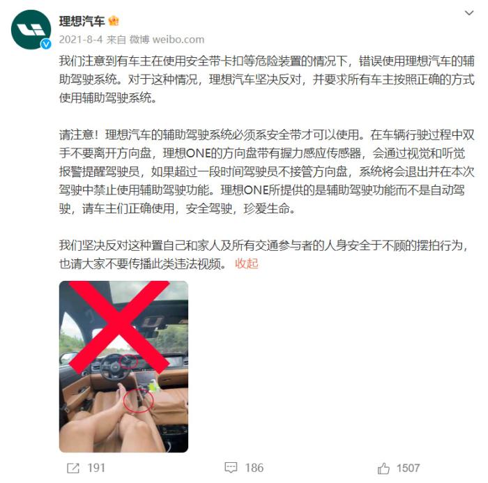 針對(duì)上述行為,理想汽車(chē)在2021年曾通過(guò)微博回應(yīng)稱,“理想汽車(chē)的輔助駕駛系統(tǒng)必須系安全帶才可以使用。在車(chē)輛行駛過(guò)程中雙手不要離開(kāi)方向盤(pán),理想ONE的方向盤(pán)帶有握力感應(yīng)傳感器,會(huì)通過(guò)視覺(jué)和聽(tīng)覺(jué)報(bào)警提醒駕駛員,如果超過(guò)一段時(shí)間駕駛員不接管方向盤(pán),系統(tǒng)將會(huì)退出并在本次駕駛中禁止使用輔助駕駛功能?!?/p>