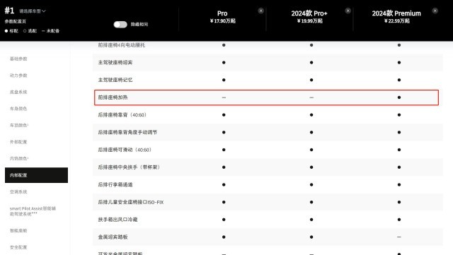 中新經(jīng)緯查詢smart官網(wǎng)發(fā)現(xiàn),前排座椅加熱等功能需要升級車型才能擁有,普通車型并未將其設(shè)為標(biāo)配。以座椅加熱功能為例,官網(wǎng)顯示,有該項(xiàng)配置的smart#1的2024款Premium為22.59萬元起,而未將該功能設(shè)為標(biāo)配的Pro車型,其價格為17.9萬元起。