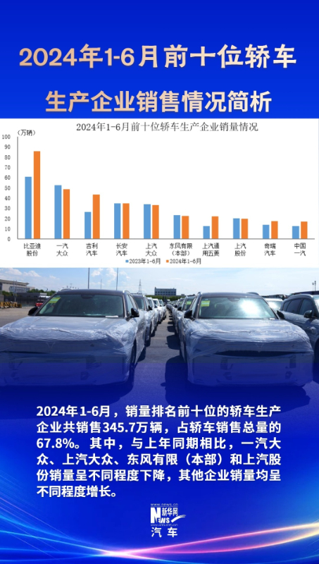 據(jù)中國汽車工業(yè)協(xié)會(huì)統(tǒng)計(jì)分析,2024年1-6月,銷量排名前十位的轎車生產(chǎn)企業(yè)共銷售345.7萬輛,占轎車銷售總量的67.8%。