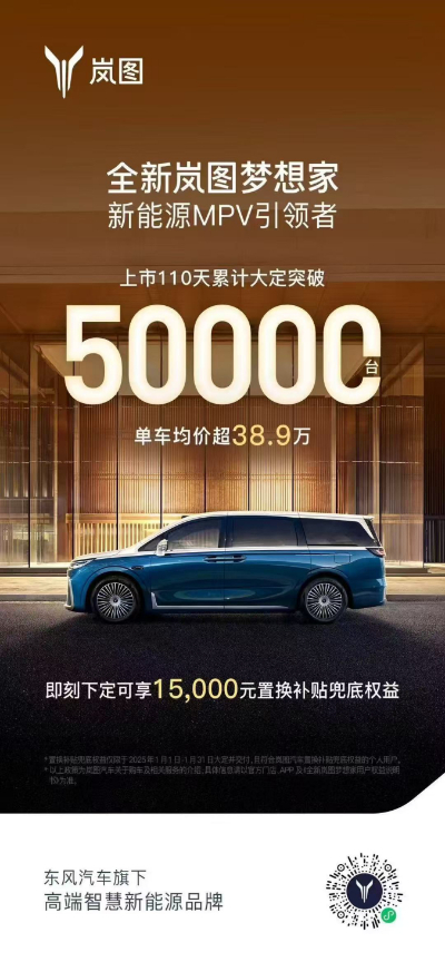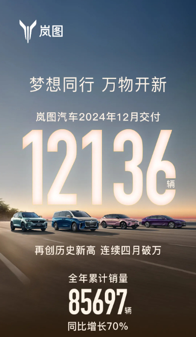 展望未來,嵐圖汽車CEO盧放表示:“2025年將推出4款以上全新或改款車,以更加完善的SUV、轎車和MPV產(chǎn)品布局,進(jìn)一步滿足廣大用戶的個性化需求。全新嵐圖夢想家將以領(lǐng)先一代的產(chǎn)品力,成為絕對爆款,夯實‘頂流’地位,同時嵐圖繼續(xù)打造更多爆款,全力沖刺全年20萬輛的銷量目標(biāo),為更多用戶提供持續(xù)、穩(wěn)定、靠譜的產(chǎn)品和服務(wù)。”