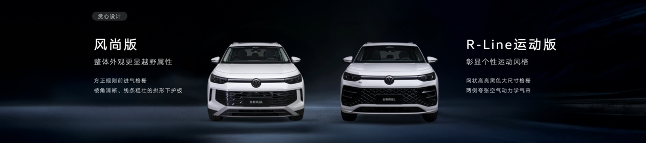 外觀造型上,為滿足當(dāng)下用戶多元化的審美需求,全新探岳L提供兩種前臉設(shè)計(jì)。其中,風(fēng)尚版車型的前臉?lè)秸乙?guī)則的進(jìn)氣格柵,輔以棱角清晰、線條粗壯的拱形下護(hù)板,整體外觀更顯越野屬性。相比之下,R-Line運(yùn)動(dòng)版則采用了品牌標(biāo)志性的網(wǎng)狀、高亮黑、大尺寸格柵,與兩側(cè)夸張的空氣動(dòng)力學(xué)氣簾相得益彰,賦予車輛更凌厲氣質(zhì),充分彰顯個(gè)性運(yùn)動(dòng)風(fēng)格。