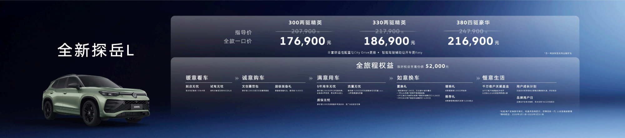 3月1日,一汽-大眾全新探岳L在五岳之首泰山震撼上市,新車共推出300TSI、330TSI、380TSI三種動(dòng)力配置共3種車型,官方指導(dǎo)價(jià)20.79萬(wàn)元起,可選裝舒適性配置豐富的City包和駕駛輔助功能Easy包?,F(xiàn)在購(gòu)買全新探岳L,還將享受17.69萬(wàn)元起的全款一口價(jià)。