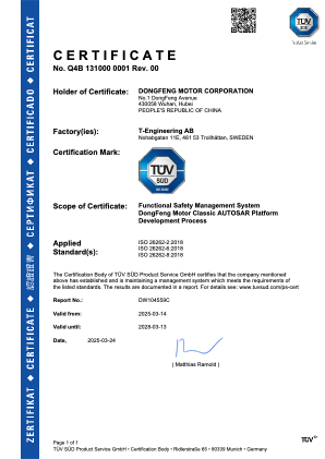 東風(fēng)汽車AUTOSAR基礎(chǔ)軟件平臺(tái)開(kāi)發(fā)流程獲TüV南德意志集團(tuán)認(rèn)證證書(shū) 在軟件定義汽車的時(shí)代,功能安全是智能汽車落地應(yīng)用的基石,更是主機(jī)廠實(shí)現(xiàn)規(guī)?;慨a(chǎn)的核心競(jìng)爭(zhēng)力。TüV南德意志集團(tuán)是國(guó)際獨(dú)立第三方檢驗(yàn)、檢測(cè)和認(rèn)證機(jī)構(gòu),在功能安全認(rèn)證領(lǐng)域享有盛譽(yù),眾多國(guó)際知名汽車電子產(chǎn)品的安全認(rèn)證均由其主導(dǎo)完成。ISO 26262是全球汽車電子功能安全領(lǐng)域的核心國(guó)際標(biāo)準(zhǔn),覆蓋從概念設(shè)計(jì)、系統(tǒng)開(kāi)發(fā)到生產(chǎn)運(yùn)營(yíng)的全生命周期,對(duì)汽車電子系統(tǒng)的安全風(fēng)險(xiǎn)管控提出嚴(yán)苛要求。其中,ASIL-D(Automotive Safety Integrity Level D)為最高安全等級(jí),代表系統(tǒng)需具備極低的故障概率和極高的可靠性。 東風(fēng)汽車自主AUTOSAR平臺(tái)獲得ISO 26262 ASIL-D級(jí)流程認(rèn)證證書(shū),充分證明了該平臺(tái)在功能安全流程管理、風(fēng)險(xiǎn)分析、開(kāi)發(fā)驗(yàn)證等方面均滿足最高安全等級(jí)要求,能夠有效支撐智能駕駛、新能源汽車等場(chǎng)景下對(duì)高安全性的需求,進(jìn)一步彰顯了東風(fēng)汽車在功能安全領(lǐng)域的技術(shù)底蘊(yùn)。 此次通過(guò)認(rèn)證,更是東風(fēng)汽車研發(fā)團(tuán)隊(duì)15年厚積薄發(fā)的成果。2010年,東風(fēng)汽車開(kāi)始布局AUTOSAR領(lǐng)域;2015年,首次實(shí)現(xiàn)AUTOSAR架構(gòu)的發(fā)動(dòng)機(jī)控制系統(tǒng)軟件開(kāi)發(fā);2018年,完成AUTOSAR架構(gòu)的發(fā)動(dòng)機(jī)控制系統(tǒng)軟件在量產(chǎn)車型上的搭載;2020年底,啟動(dòng)新一代全自主經(jīng)典AUTOSAR基礎(chǔ)軟件平臺(tái)開(kāi)發(fā),從底層協(xié)議棧到上層應(yīng)用軟件實(shí)現(xiàn)全棧自主可控;2024年3月,正式向國(guó)際權(quán)威認(rèn)證機(jī)構(gòu)提交ISO 26262功能安全流程認(rèn)證申請(qǐng);2025年3月,歷時(shí)近一年完成從需求分析、架構(gòu)設(shè)計(jì)到代碼驗(yàn)證的全流程合規(guī)性審查,最終以零缺陷通過(guò)ASIL-D等級(jí)認(rèn)證。 據(jù)悉,2025年9月前,東風(fēng)汽車將進(jìn)一步完成自主經(jīng)典AUTOSAR基礎(chǔ)軟件平臺(tái)首批10+模塊的功能安全I(xiàn)SO 26262 ASIL-D產(chǎn)品認(rèn)證;12月,完成所有模塊的功能安全I(xiàn)SO 26262 ASIL-D產(chǎn)品認(rèn)證,構(gòu)建覆蓋車身控制、動(dòng)力總成、智能駕駛等核心領(lǐng)域的全場(chǎng)景安全解決方案。 同時(shí),東風(fēng)汽車將強(qiáng)化協(xié)同合作,深化產(chǎn)業(yè)鏈上下游協(xié)作,構(gòu)建國(guó)產(chǎn)汽車軟件生態(tài)共同體;依托自主經(jīng)典AUTOSAR基礎(chǔ)軟件平臺(tái),加速推進(jìn)高階自動(dòng)駕駛、智能座艙等創(chuàng)新項(xiàng)目,為用戶提供更安全、更智能的出行體驗(yàn),助力中國(guó)汽車產(chǎn)業(yè)高質(zhì)量發(fā)展。 (責(zé)任編輯:蔡文斌) |