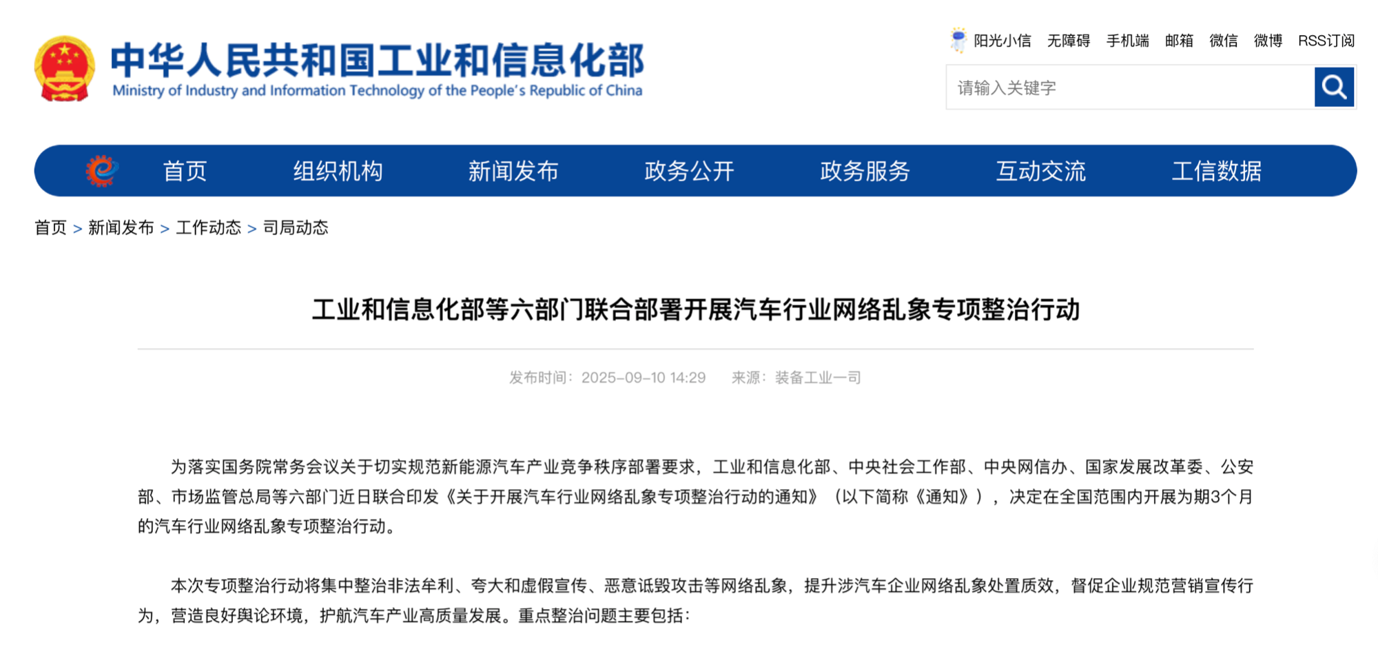 央廣網(wǎng)北京9月10日消息(記者董楠)9月10日,工業(yè)和信息化部(以下簡(jiǎn)稱(chēng)“工信部”)、中央社會(huì)工作部、中央網(wǎng)信辦、國(guó)家發(fā)展改革委、公安部、市場(chǎng)監(jiān)管總局等六部門(mén)聯(lián)合印發(fā)《關(guān)于開(kāi)展汽車(chē)行業(yè)網(wǎng)絡(luò)亂象專(zhuān)項(xiàng)整治行動(dòng)的通知》,決定在全國(guó)范圍內(nèi)開(kāi)展為期3個(gè)月的汽車(chē)行業(yè)網(wǎng)絡(luò)亂象專(zhuān)項(xiàng)整治行動(dòng)。