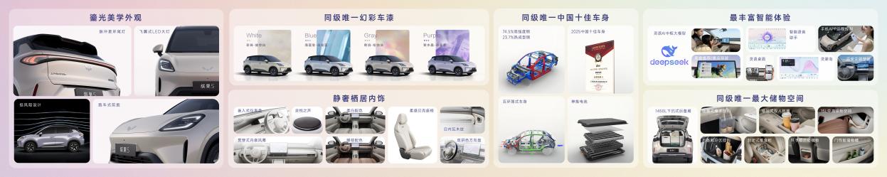 步入“舒嶼座艙”,細(xì)節(jié)皆巧思。繽果S以“靜奢棲居美學(xué)”為靈感,通過環(huán)抱式布局、貫穿式內(nèi)嵌風(fēng)幕與柔感貝殼座椅等設(shè)計,營造出沉浸式的舒適氛圍。搭配同級唯一的6揚(yáng)聲器系統(tǒng)與阿嘉米斯專業(yè)聲場調(diào)校,進(jìn)一步提升了座艙的靜謐質(zhì)感與聽覺享受。12.8英寸高清大屏內(nèi)置“1+N”靈語AI中樞大模型,深度融合DeepSeek大模型,以更全面的壁紙玩法、八大區(qū)域的方言溝通、更多的智能場景應(yīng)用,為用戶帶來真正“更懂你的”智能座艙體驗。