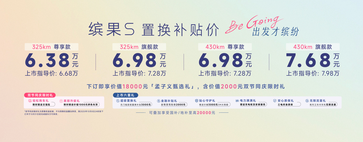 繽果S共推出325km尊享款、325km旗艦款、430km尊享款、430km旗艦款四款配置,上市指導(dǎo)價為6.68萬-7.98萬元,疊加置換政策可享置換補(bǔ)貼價6.38萬-7.68萬元,更可疊加享受至高20,000元的國家/地方購車補(bǔ)貼。