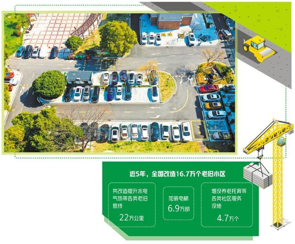 近年來,老舊小區(qū)改造取得積極進(jìn)展。住房和城鄉(xiāng)建設(shè)部最新統(tǒng)計(jì)數(shù)據(jù)顯示,近年來,各地在老舊小區(qū)改造中,共改造提升水電氣熱等各類老舊管線22萬公里,加裝電梯6.9萬部,增設(shè)停車位240萬個(gè)、電動(dòng)汽車充電樁6.8萬個(gè),增設(shè)養(yǎng)老托育等各類社區(qū)服務(wù)設(shè)施4.7萬個(gè)。