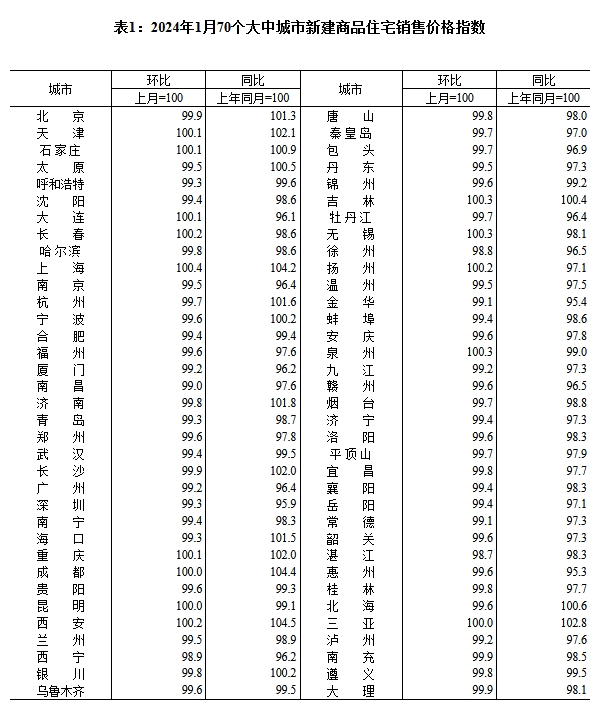 中新網(wǎng)2月23日電 國(guó)家統(tǒng)計(jì)局網(wǎng)站發(fā)布2024年1月份70個(gè)大中城市商品住宅銷售價(jià)格變動(dòng)情況。國(guó)家統(tǒng)計(jì)局城市司統(tǒng)計(jì)師王中華解讀表示,2024年1月份,70個(gè)大中城市中商品住宅銷售價(jià)格環(huán)比下降城市個(gè)數(shù)減少,商品住宅銷售價(jià)格環(huán)比降幅整體收窄、同比整體延續(xù)降勢(shì)。