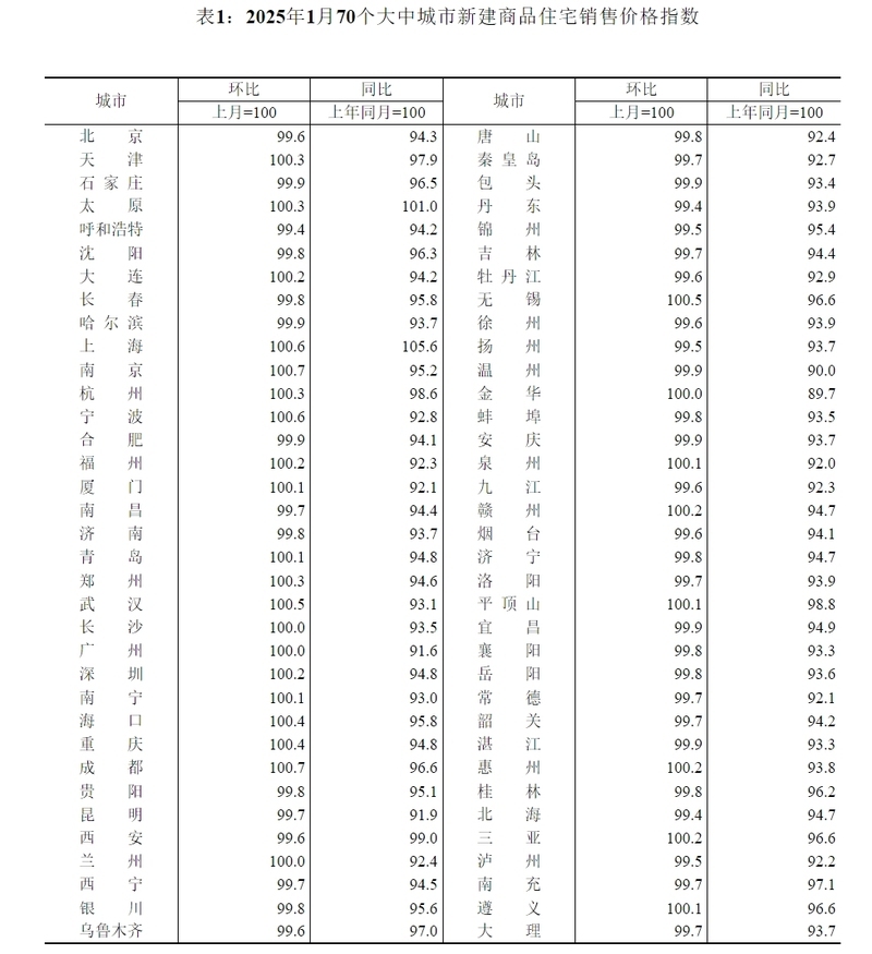 國(guó)家統(tǒng)計(jì)局城市司首席統(tǒng)計(jì)師王中華解讀稱:“2025年1月份,70個(gè)大中城市中,一線城市商品住宅銷售價(jià)格環(huán)比繼續(xù)上漲,二三線城市環(huán)比總體略降;一二三線城市同比降幅均持續(xù)收窄。”