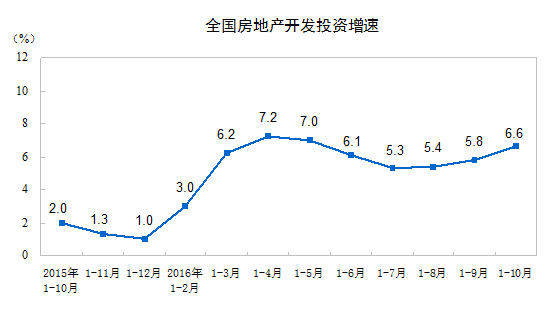 2016年1-10月份,全國房地產開發(fā)投資83975億元,同比名義增長6.6%,增速比1-9月份提高0.8個百分點。其中,住宅投資56294億元,增長5.9%,增速提高0.8個百分點。住宅投資占房地產開發(fā)投資的比重為67.0%。