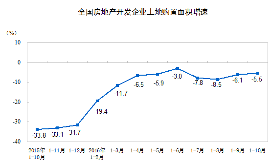 1-10月份,房地產開發(fā)企業(yè)土地購置面積16873萬平方米,同比下降5.5%,降幅比1-9月份收窄0.6個百分點;土地成交價款6764億元,增長16.7%,增速提高3.4個百分點。
