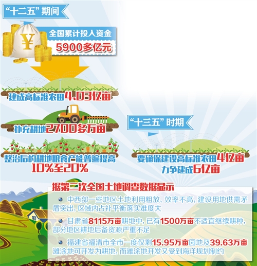 同時(shí),對(duì)耕地的建設(shè)性保護(hù)也迫在眉睫?!敖ㄔO(shè)性保護(hù)指通過(guò)工程措施改善耕地質(zhì)量?!敝醒朕r(nóng)辦副主任韓俊介紹,近年來(lái),國(guó)家大力推進(jìn)土地整治與高標(biāo)準(zhǔn)農(nóng)田建設(shè),有效彌補(bǔ)了耕地產(chǎn)能損失。僅高標(biāo)準(zhǔn)農(nóng)田建設(shè)一項(xiàng),“十二五”期間,全國(guó)累計(jì)投入資金5900多億元,建成高標(biāo)準(zhǔn)農(nóng)田4.03億畝,補(bǔ)充耕地2700多萬(wàn)畝,整治后的耕地糧食產(chǎn)能普遍提高10%至20%?!笆濉睍r(shí)期,要確保建設(shè)高標(biāo)準(zhǔn)農(nóng)田4億畝,力爭(zhēng)建成6億畝。